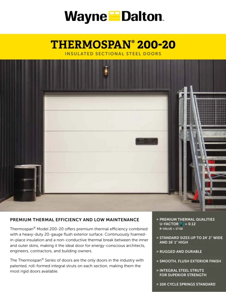 Thermospan® Model 200-20 is the ideal commercial sectional door for energy-conscious architects, engineers, contractors, and building owners. With a U-value* of 0.057 and R-value* of 17.5, this door outperforms most conventional insulated steel doors.